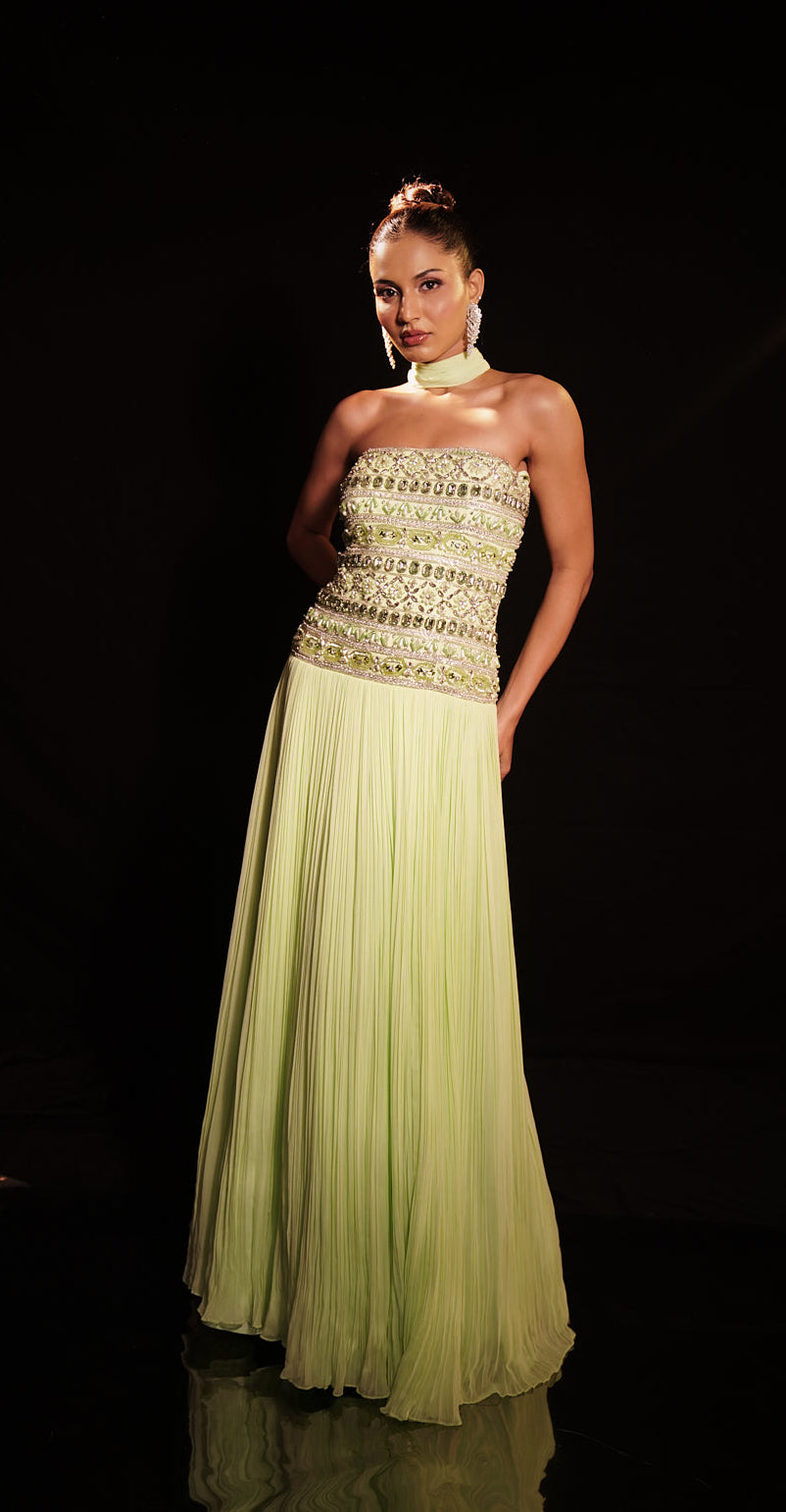 Enchanting Olive Elegance: Pearl-Embroidered Dress with Organza Jacket